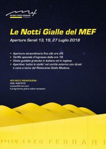 Ritornano gli appuntamenti serali al Museo Enzo Ferrari di Modena. Il 18 e 25 luglio il MEF sarà aperto eccezionalmente fino alle ore 24 e dalle 19 sarà possibile visitare al prezzo speciale di 8 euro il Museo dei Motori e la mostra ‘Capolavori senza tempo’, che riunisce alcuni dei modelli più eleganti della storia della Casa.